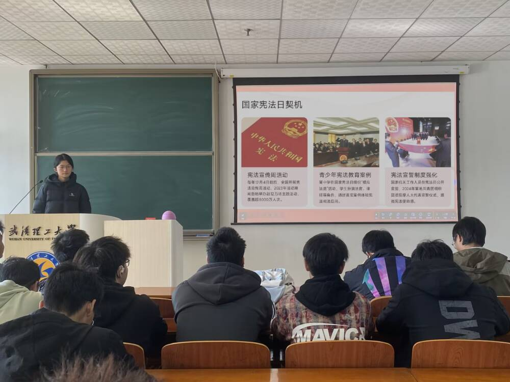 活动伊始,杨曦雅以第十二个国家宪法日为切入点,结合全国“宪法宣传周”活动部署,通过图文展板与普法短片相结合的形式,向团员青年系统介绍了国家宪法日的设立背景、发展历程以及宪法作为国家根本大法的核心地位与重要意义。她着重讲解了今年“宪法宣传周”、“学习宣传贯彻习近平法治思想,推动宪法深入人心”主题的深刻内涵,强调宪法不仅是治国安邦的总章程,更是保障青年合法权益、指引青年成长方向的根本遵循。