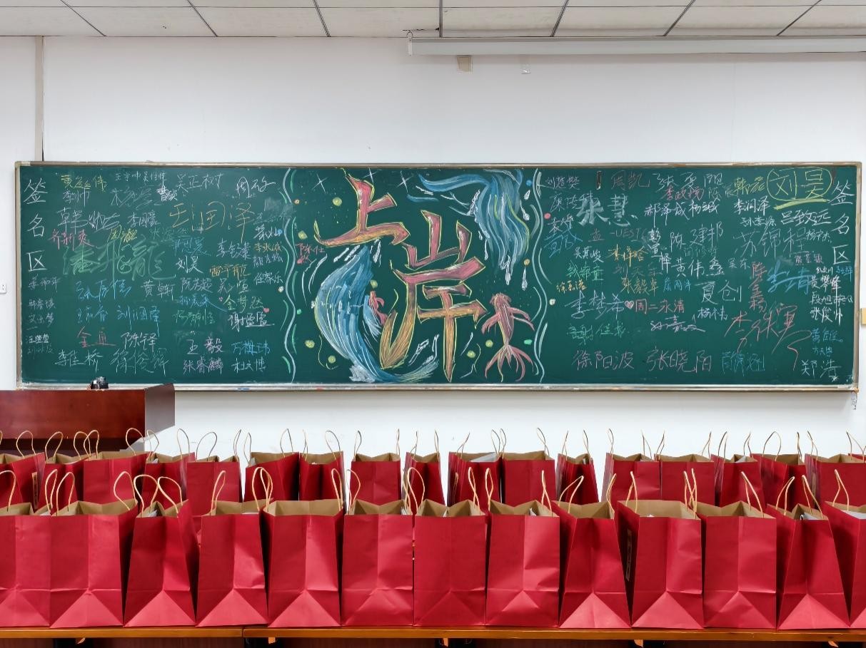 除此之外,公司还在爱特楼401教室精心布置了“考研加油打卡点”。教室黑板上绘制了寓意“锦鲤上岸”的彩色图案,寄托着对考研学子金榜题名的美好祝愿。现场还设置了签名墙,吸引了不少考研学子前来参与,他们或认真签名,或与黑板上的锦鲤图案合影,现场气氛温馨而热烈。